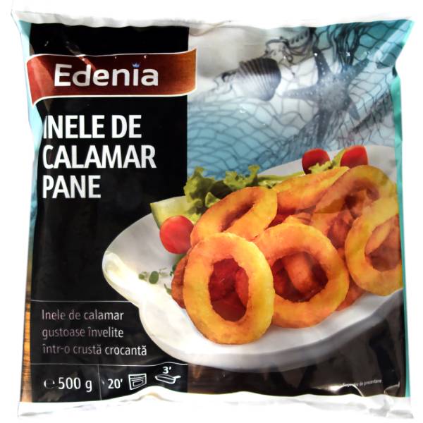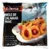 Inele de calamar pane. Produs congelat, preprajit.Calamar din Oceanul Atlantic (FAO 41), metoda captura: pescuit extractiv.